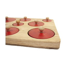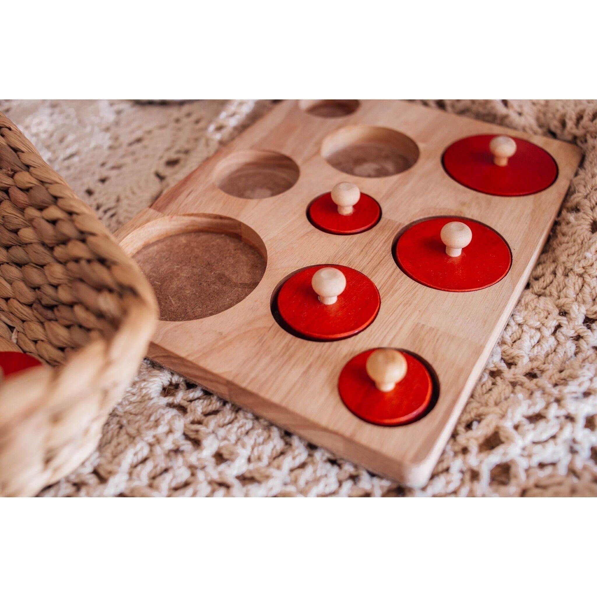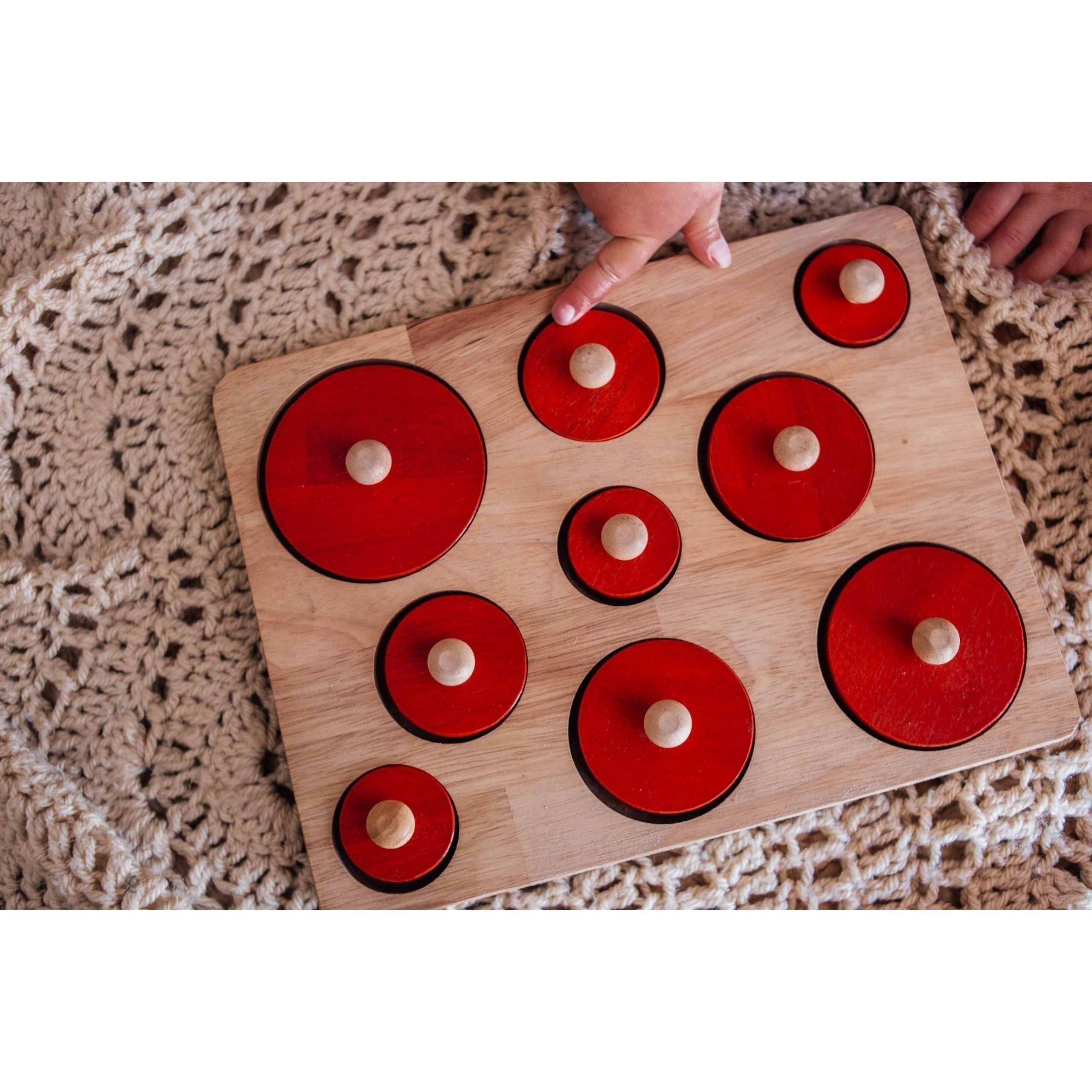 This beautiful Size Puzzle, Montessori inspired, comes with 9 beautiful red wooden pieces. Each in a different size with a knob for children to easily grasp. Helping children develop size discrimination and motor skills. By having the same shape puzzle piece your child is able to focus on the size and matching them to the matching space. All Qtoys products are made out of the plantation timber using non toxic child safe materials. Size: 27 x 20 cm